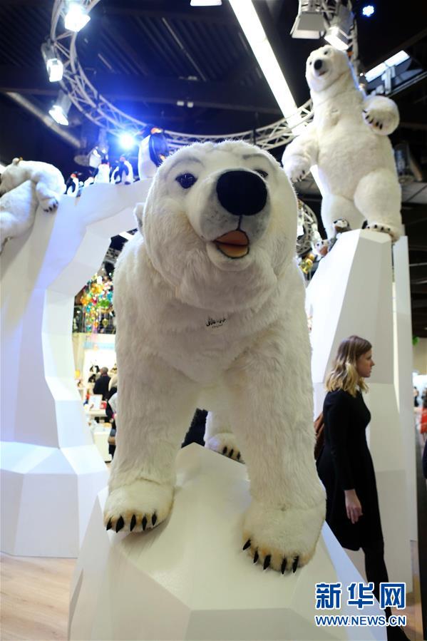 这是2月3日在德国纽伦堡国际玩具展上拍摄的玩具北极熊。