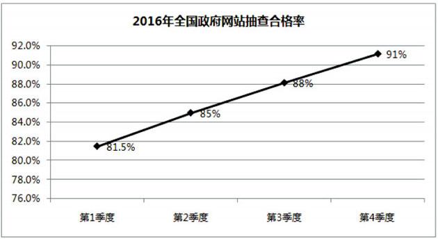各地区和71个国务院部门共抽查本地区、本部门政府网站7535个,占全国政府网站运行总数的16%,总体合格率91%。其中,国务院部门(含内设、垂直管理机构)政府网站抽查合格率为97.2%,各地区政府网站抽查合格率为90.8%。抽查发现的不合格政府网站正在进行整改。国务院办公厅政府信息与政务公开办公室对各地区、各部门上报的情况进行了人工复核,总体上看,数据准确真实。同时,2016年第三季度发现的不合格网站中97%已完成整改或关停上移。