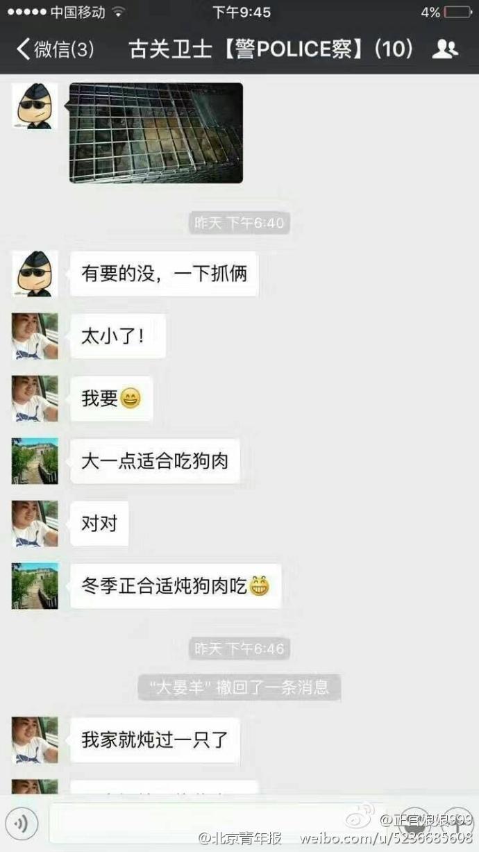 北京青年报【网曝派出所所长带头吃流浪狗 怀柔警方已介入调查】近日有网友爆料称,北京怀柔区某派出所所长在微信群里带头抓流浪狗吃。在网友发布的名为“谷关卫士”的微信群聊天截屏中,有人发布了一张流浪狗在狗笼中的照片,并询问:“有要的没?一下抓俩。”有人回复“要”之后,另一人评论称:“大一点适合吃狗肉”,并声称冬季正合适炖狗肉吃。10日下午,怀柔分局对外答复称,分局已获知此事,正在介入调查,目前尚无法确定是否属实。