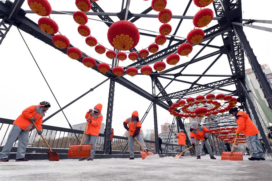2月21日,工作人员在甘肃省兰州市黄河中山铁桥清理积雪融化后的冰碴。当日,全国多地出现降雪天气。 新华社记者 范培珅 摄