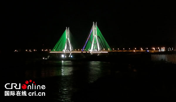 由中国交建承建的布拉柴维尔沿河大道斜拉桥夜景。(王新俊 摄)