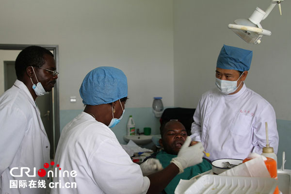 第23批中国援刚果(布)医疗队员庞国星(右一)指导当地医生进行口腔手术。(王新俊 摄)