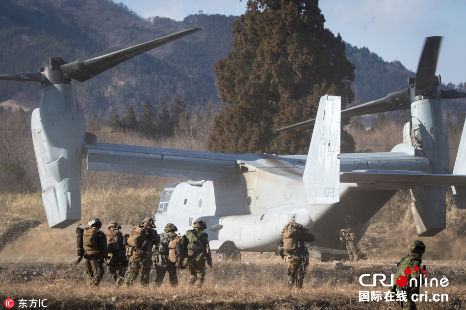 当地时间2017年3月10日,日本群马县,日本陆上自卫队与美国海军陆战队在陆自相马原演习场举行日美联合训练。图片来源:东方IC