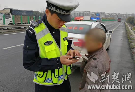 3月10日上午10时,湖北高速交警蔡甸大队民警郑冠军、叶钦刚巡逻至京港澳高速江夏区郑店段,发现高速护栏边斜靠着一个男孩。