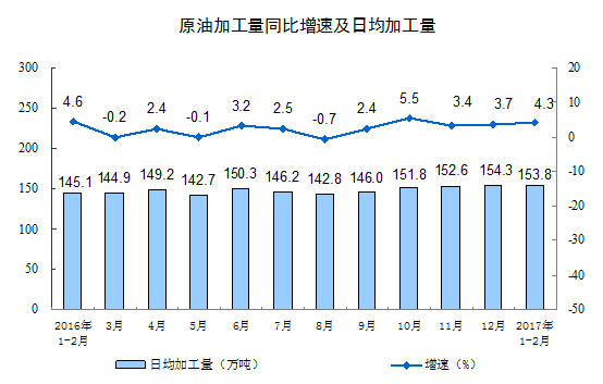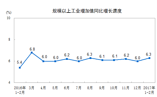 国际在线消息:据国家统计局网站消息,2017年1-2月份,规模以上工业增加值同比实际增长6.3%(下同,增加值增速均为扣除价格因素的实际增长率),较2016年12月份加快0.3个百分点;从环比看,2月份,规模以上工业增加值比上月增长0.60%。