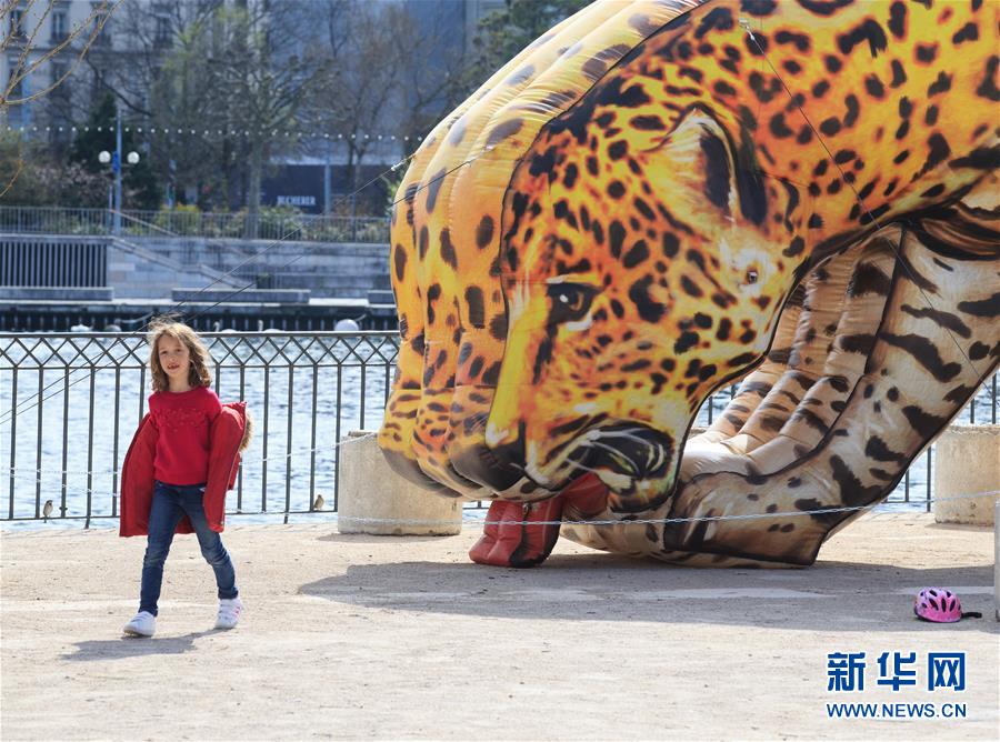 3月22日,在瑞士日内的瓦罗纳河和莱蒙湖交汇处的卢梭岛上,一名女童从巨型充气美洲豹旁走过。当日是“世界水日”,一件名为“饮水的美洲豹”的巨型充气作品被安置在日内瓦的卢梭岛上,以反映自然界中很多动物因缺水而面临的困境。这件作品由巴西艺术家爱德华多·斯普尔创作,将在卢梭岛上展出到7月2日。新华社记者 徐金泉 摄