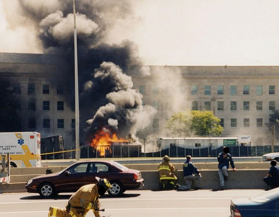 当时,本·拉登领导的基地组织的五名恐怖分子劫持了一架美国航空的波音757飞机,并带着机上的乘客把飞机撞入五角大楼中。照片中也能看到这架飞机的残骸。