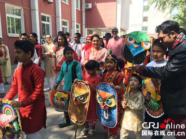 孟加拉国的小朋友们手举各种吉祥图案的面具开始了庆祝活动。