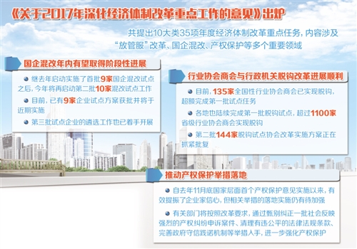 日前,国务院批转了国家发展改革委《关于2017年深化经济体制改革重点工作的意见》(简称《意见》),提出了10大类35项年度经济体制改革重点任务,内容涉及“放管服”改革、国企混改、产权保护等多个重要领域。