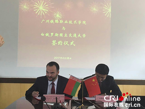 广州铁路职业技术学院今天(28日)与白俄罗斯国立交通大学签订了“亚欧高铁合作学院”共建合作协议。