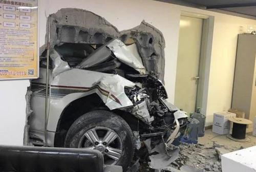 4月26日下午,北京华贸中心地下停车场,一白色越野车突然穿墙撞进一间办公室,坐在沙发上的男子直接被撞到对面墙上。