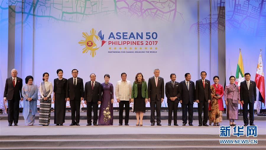 4月29日,在菲律宾首都马尼拉,与会领导人及配偶在第30届东盟峰会开幕式上合影。 第30届东盟峰会29日在菲律宾首都马尼拉开幕。新华社发(乌马利摄)