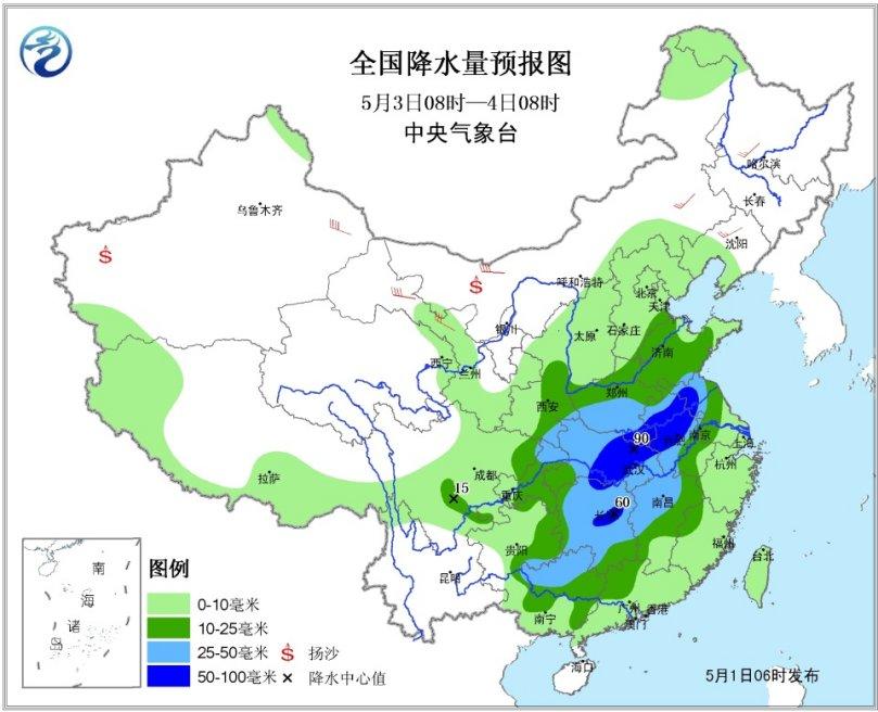3日08时至4日08时,中东部地区降水范围扩大,雨带东移。华北南部、黄淮、江淮、江汉、江南大部、华南北部、陕西中南部、四川盆地东部、贵州东部等地的部分地区有中到大雨,其中,安徽中北部、江苏西北部、湖北中东部、湖南北部等地局地有暴雨(50~90毫米)。新疆东部、甘肃中西部、内蒙古大部、东北大部等地有4~6级风。黄海南部海域将有6~8级、阵风9~10级的东南风。