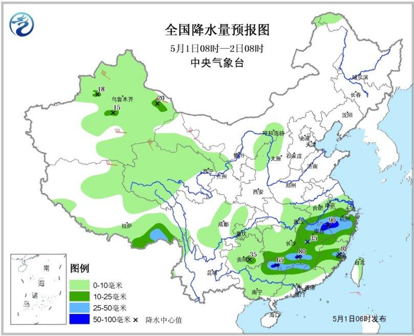 5月1日,受切变线影响,西南地区东部、江南、华南等地自西向东有小到中雨,其中江南中北部和南部、华南北部等地的局部地区有大雨或暴雨,并伴有短时强降水。