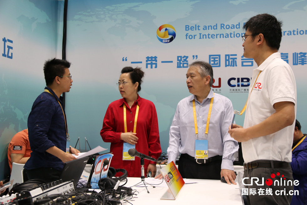 任谦副总编(右二)和直播人员交流。 摄影:黎萌