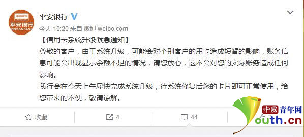 上午10时平安银行通过官方微博发布通知称,“尊敬的客户,由于系统升级,可能会对个别客户的用卡造成短暂的影响,账务信息可能会出现显示余额不足的情况,请您放心,这不会对您的实际账务造成任何影响。我行会在今天上午尽快完成系统升级,待系统修复后您的卡片即可正常使用,给您带来的不便,敬请谅解”。
