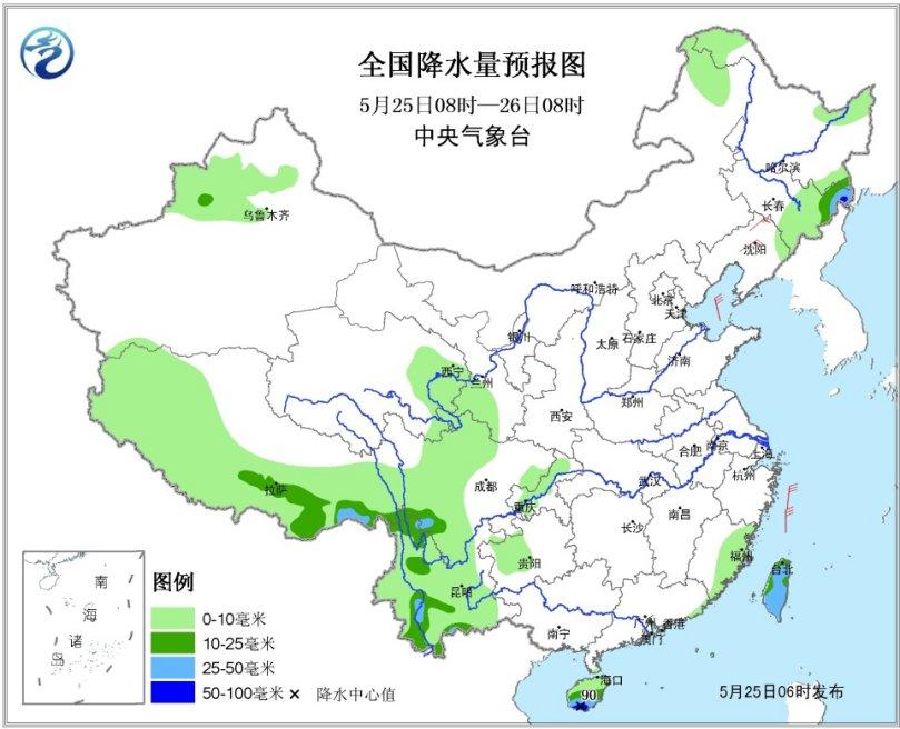 25日08时至26日08时,吉林东部、西藏、四川西部和南部、云南、海南岛等地有小到中雨,其中吉林东北部、云南南部、海南岛南部等地局地有大雨或暴雨(50~90毫米)。渤海、黄海北部有6~8级风、阵风9级(见图1)。