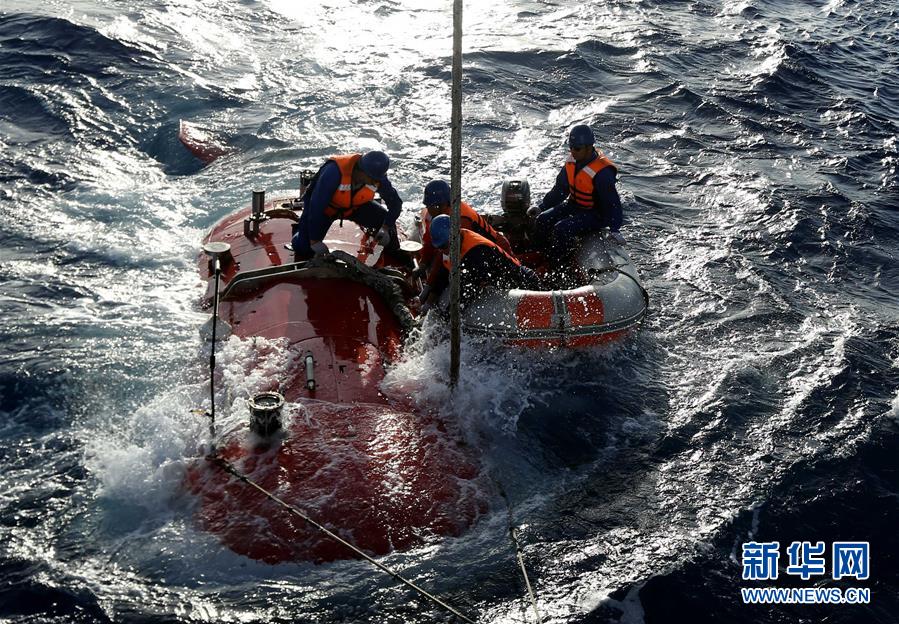 5月25日,“蛟龙”号下潜归来,“蛙人”为其挂上主缆。当日,“蛟龙”号载人潜水器进行中国大洋38航次第三航段第2潜,这也是继5月23日在世界最深处马里亚纳海沟进行今年首潜后的第二次下潜。每次“蛟龙”号布放和回收,4名有“蛙人”之称的随船工作人员都要负责在“蛟龙”号布放时解缆、回收时挂缆的工作。 “蛟龙”号入水前,他们就早早地乘橡皮艇在海中候着。“蛟龙”号入水后,由一人指挥,两人拽住“蛟龙”号,另一人爬上“蛟龙”号,给潜水器解开主缆和拖曳缆;回收时,则是挂上主缆和拖曳缆。大洋风浪大,橡皮艇摇晃严重,他们的活儿是技术和勇气兼备的工作。新华社记者 刘诗平摄
