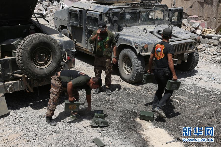 5月29日,在伊拉克摩苏尔西城萨哈区,几名士兵在搬运弹药。