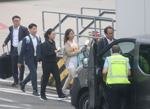 5月30日,在荷兰阿姆斯特丹机场跑道,韩国检方人员护送郑某上车。