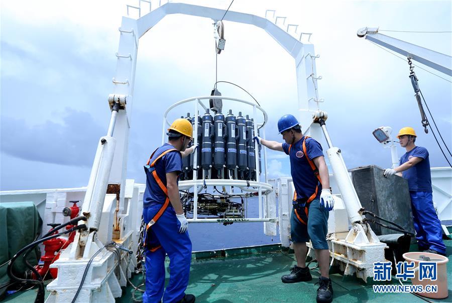 6月3日,科考队员用温盐深仪(CTD)进行海水温度、盐度、深度等常规环境调查。刚刚在马里亚纳海沟完成5次下潜的“蛟龙”号载人潜水器,未来数天内将在雅浦海沟进行5次下潜,6月4日进行第一潜。新华社记者 刘诗平 摄