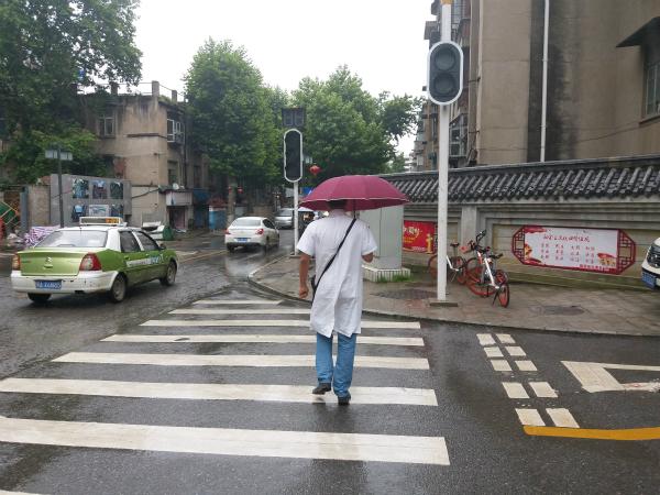 5月23日下午两点,张耀东出门去湖北中医药大学国医堂实习。图为他过马路时。