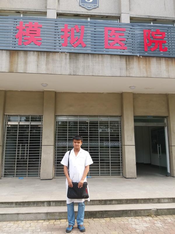 张耀东在学校模拟医院门口。