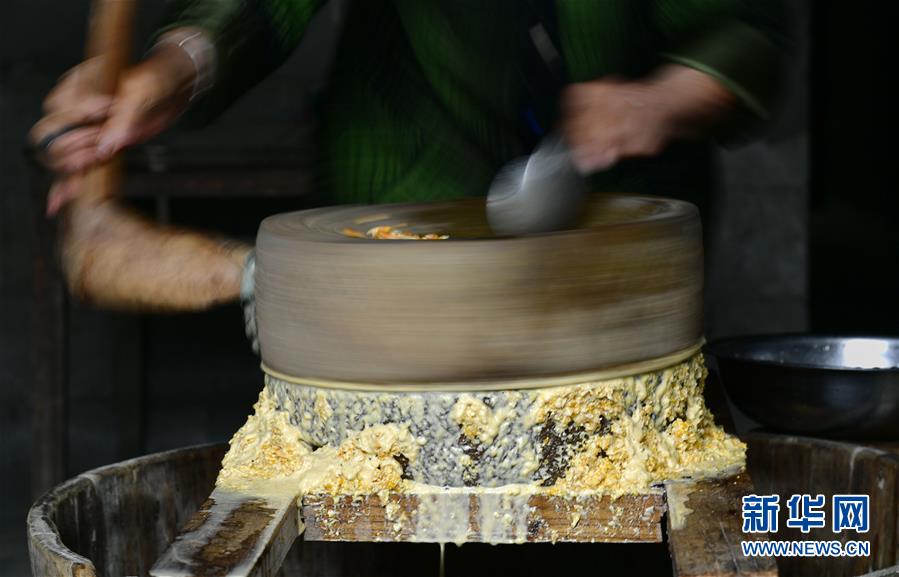 6月15日,湖北省宣恩县李家河镇八洲坝村的村民用石磨将包谷磨成熬制“包谷糖”的浆。在湖北省恩施土家族苗族自治州农村,人们将包谷(即玉米)浸泡、磨浆,拌上麦芽发酵3小时左右,然后过滤出含糖的水,并经数小时熬制而形成块状糖。极具土家乡村风味的“包谷糖”,饱含着土家人香甜的回忆。新华社发(宋文 摄)