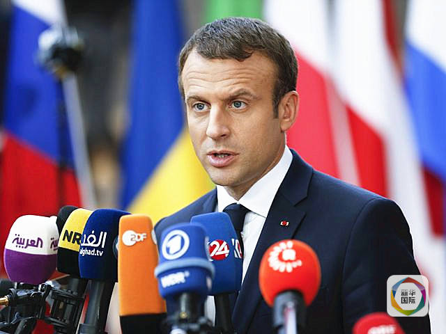 6月22日,布鲁塞尔,抵达欧盟首脑峰会会场的法国总统马克龙对媒体记者发表讲话。(新华社记者叶平凡摄)