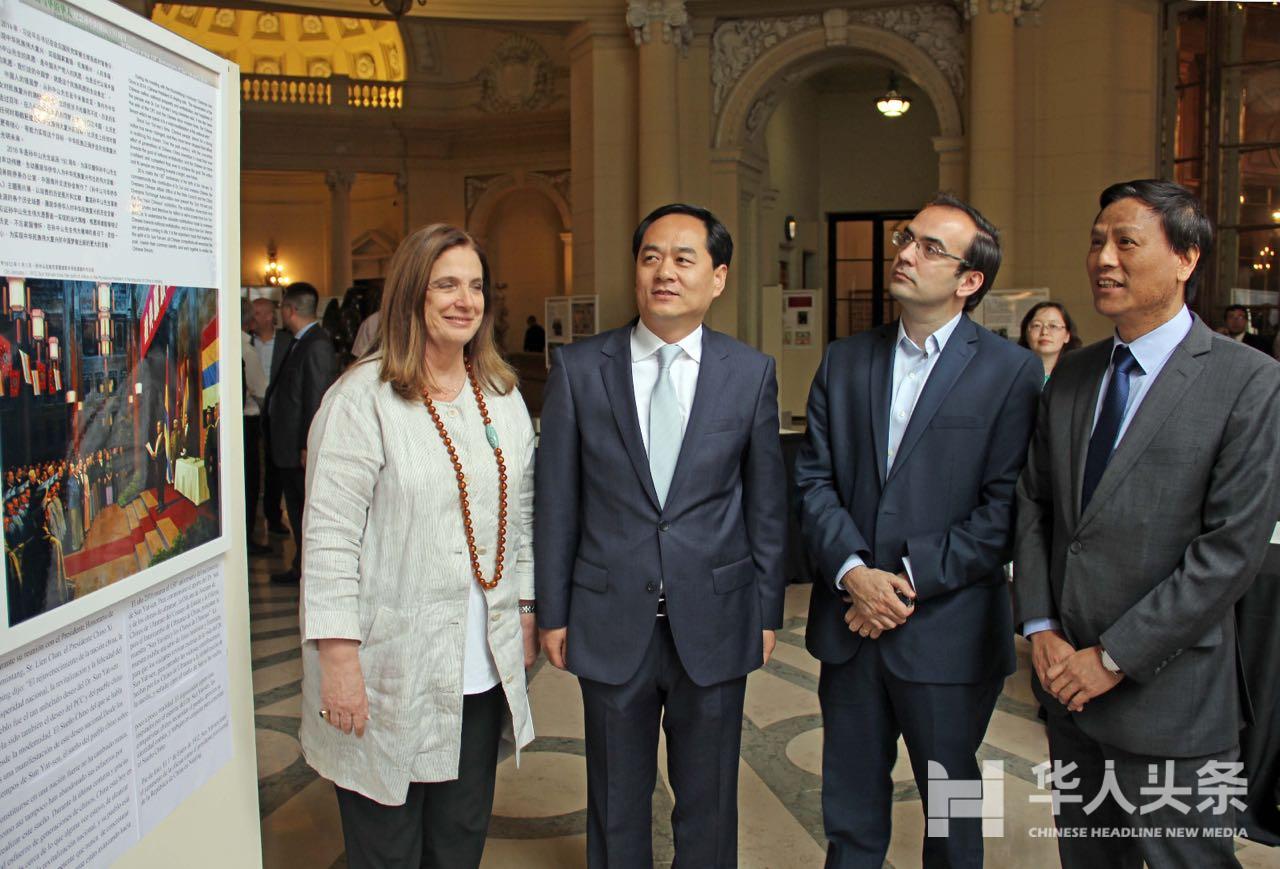 在布市议会召开的“纪念孙中山先生诞辰150周年”大型图片展,左起:第一副议长Carmen Polledo、中国驻阿根廷大使杨万明、布市议会Pro党团主席、袁建平议员