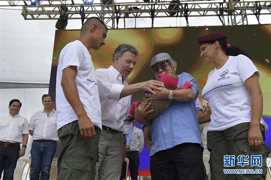 6月27日,在哥伦比亚中部梅塔省梅塞塔市,哥伦比亚总统桑托斯(前左二)与“哥伦比亚革命武装力量”(简称“哥武”)领导人罗德里格·隆多尼奥·埃切韦里(前右二)望着一对“哥武”成员夫妇的孩子。当日,“哥武”正式解除武装的庆祝仪式在哥中部梅塔省梅塞塔市举行。二十世纪60年代以来,“哥武”与政府军的武装冲突造成逾22万人死亡、数百万人流离失所。从2012年哥伦比亚政府与“哥武”举行和谈,到2016年11月桑托斯和隆多尼奥签署和平协议,和平进程波折重重,和平实现来之不易。新华社发(哥伦比亚总统府供图)