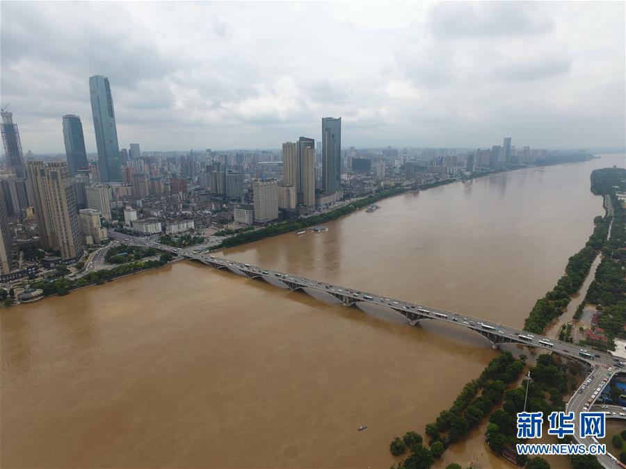 遭遇洪水侵袭的长沙橘子洲大桥附近湘江航道,城区沿江亲水步道全部被水淹没(7月4日摄)。