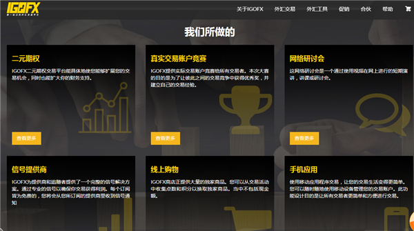IGOFX网站上宣传该公司的业务范围,包括二元期权、真实交易账户竞赛、网络研讨会、信号提供商、线上购物、手机应用等。