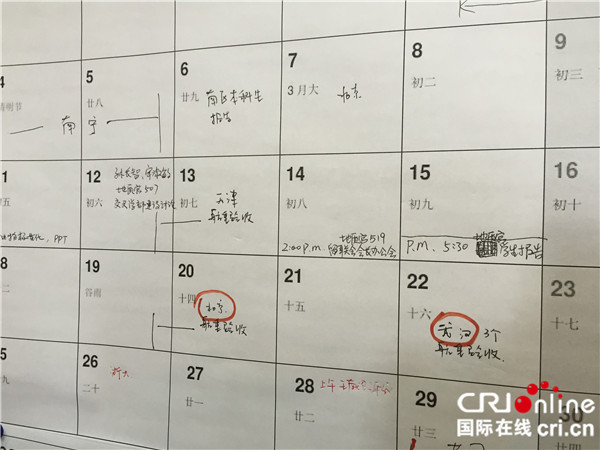 2009年,黄大年刚一回国,就迅速投入到高强度的工作中。吉林大学“地质宫”五楼,黄大年办公室里的一块记事板上,密密麻麻地记录了一整年的工作安排:长春、北京、南宁、成都、伦敦……无数地名见证了黄大年匆忙的足迹。而这间办公室的灯,通常都会亮到凌晨两三点钟。