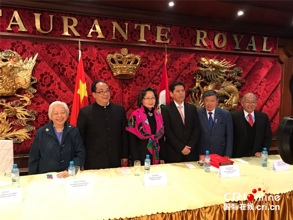 秘中商会秘书长何莲香、秘中友谊基金会会长罗兆雄、文化参赞朱晓燕、秘鲁国家邮政局长恩里克、利马大区区长尼尔森、秘中文化协会主席杨莫塔在首发式上