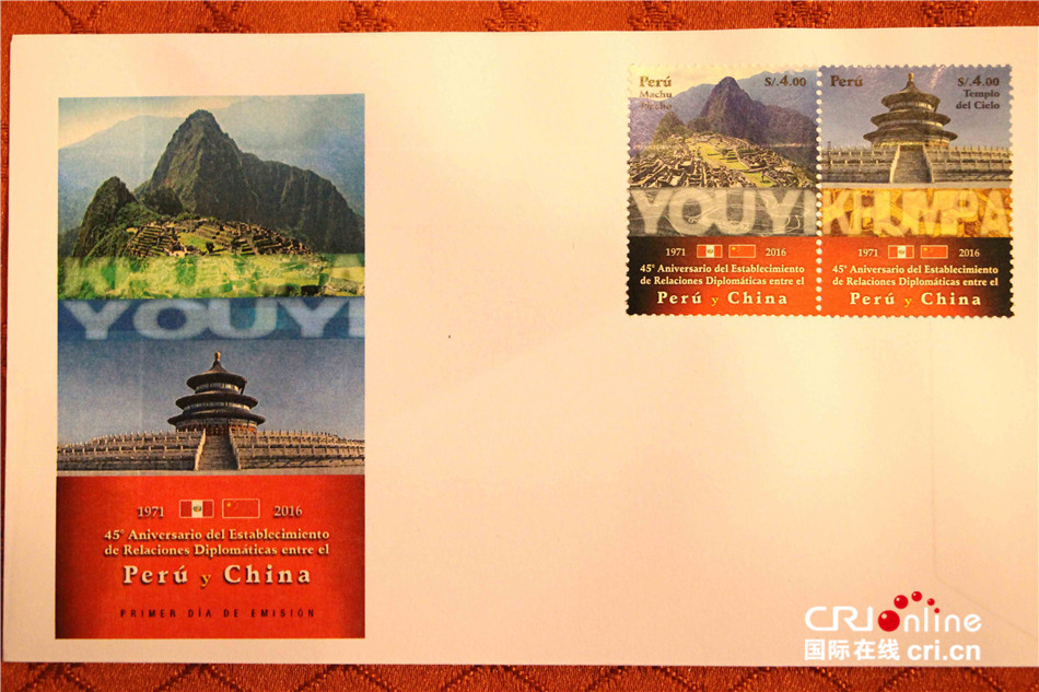 中国与秘鲁两国于1971年建交,2016年是中秘建交45周年。为纪念这一中秘交流史上的重要时刻,中秘建交45周年纪念邮票由中国天坛和秘鲁马丘比丘两枚邮票组成,配有汉语拼音和秘鲁克丘亚语“友谊”字样。中国美食纪念邮票精选了秘鲁民众最喜爱的中式佳肴:炒饭、馄饨、炒面和红烧豚鼠。
