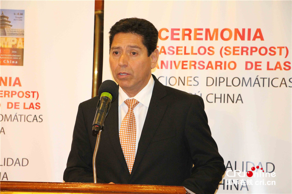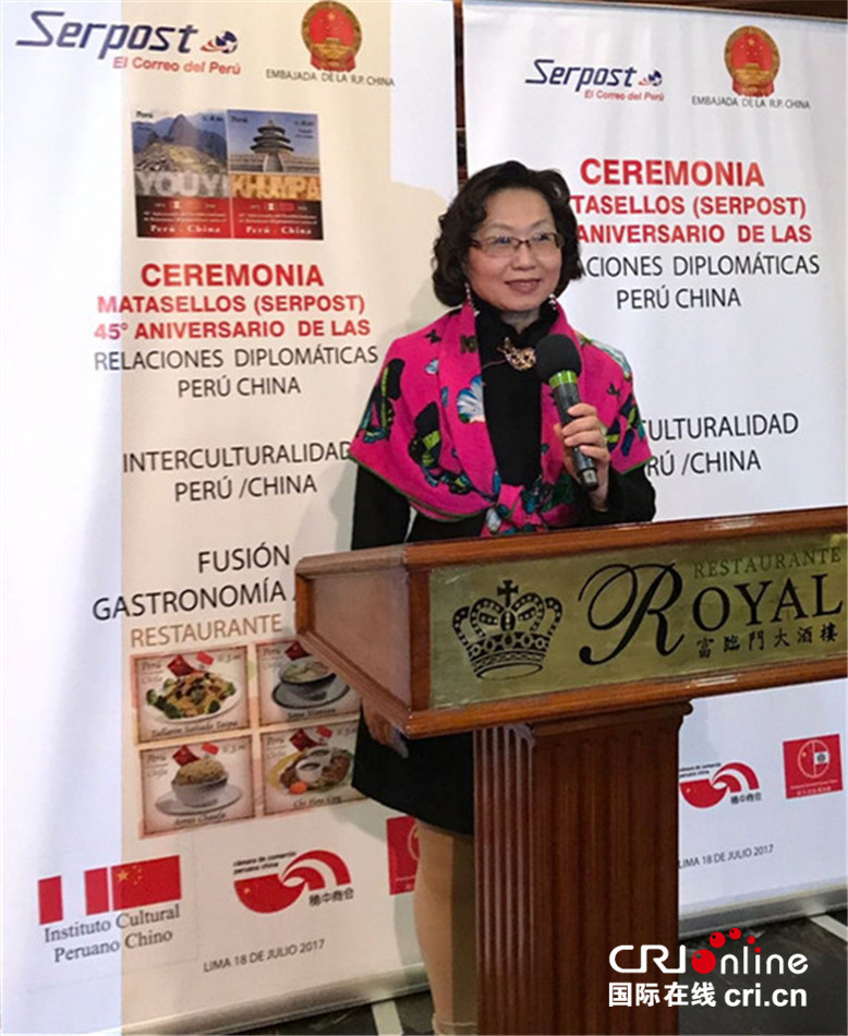 国际在线报道(中国国际广播电台记者 宫祥诚):当地时间7月18日,中国与秘鲁建交45周年和中国美食两套纪念邮票及首日封首发式在秘鲁首都利马举行。本次活动由中国驻秘鲁大使馆、秘鲁国家邮政局、秘中文化协会、秘中友谊基金会联合举办。中国驻秘鲁大使馆文化参赞朱晓燕、秘鲁国家邮政局总经理恩里克、秘中文化协会会长杨莫塔、利马大区区长尼尔森等出席。