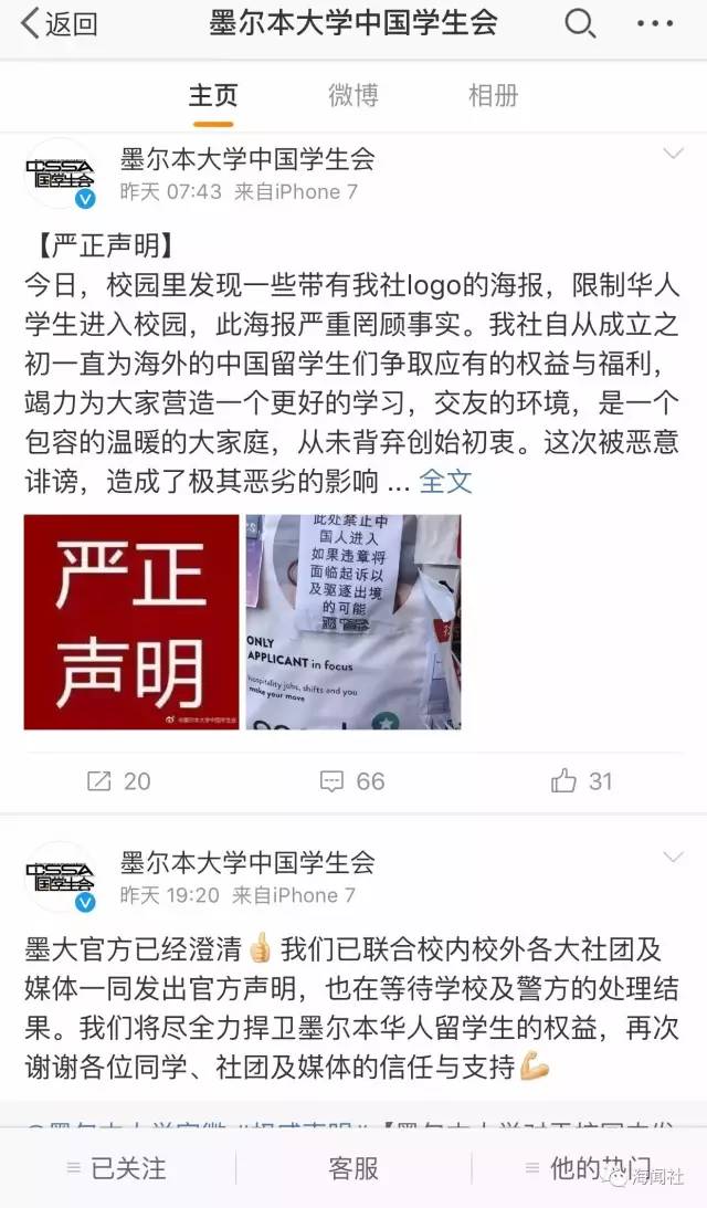 从图片上可以看到,公告的右上角是墨尔本大学的标识,而下方却是“墨大中国学生会CSSA”的标识。这难道是中国人在黑自己人?记者在微博上搜索到“墨大中国学生会”的官方账号,发现 “中国学生会”已经针对此事发布微博,进行了澄清。