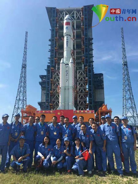 2017年4月,海南文昌发射基地,刘立东(后排左4)所在“长七”火箭总体设计团队在“长七”遥二发射现场。本人供图