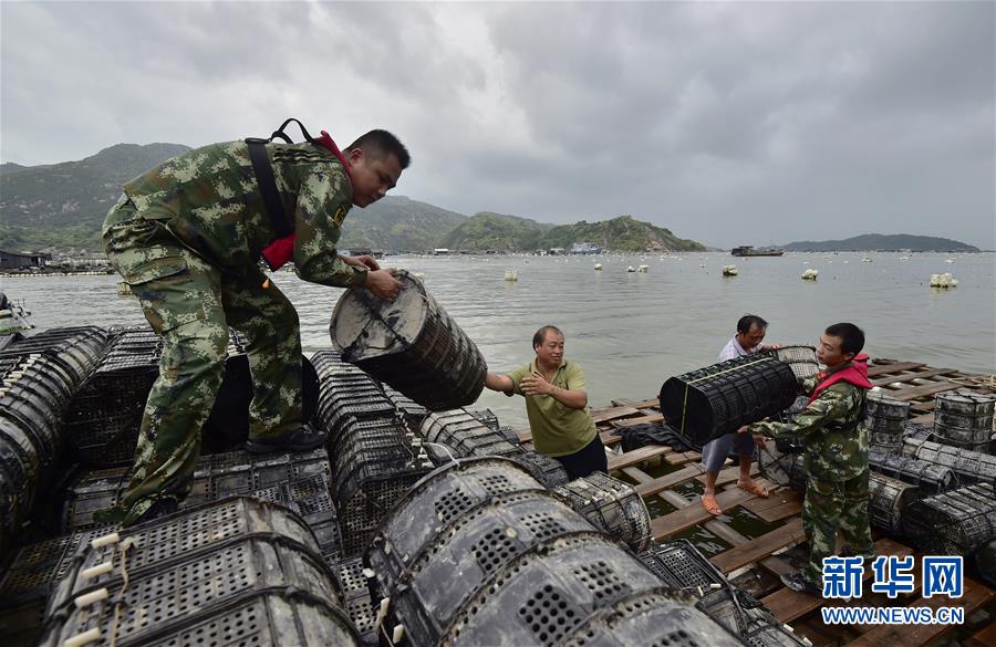 7月29日,在福建省宁德市蕉城区三都澳养殖区,宁德公安边防支队官兵帮助渔民搬运鲍鱼笼。