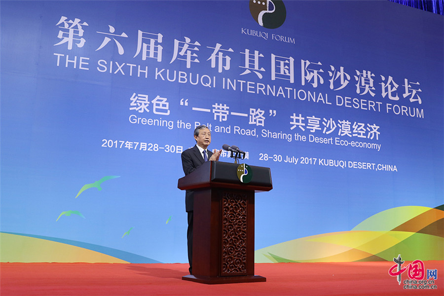 中国网7月29日讯(记者 郑亮 李佳)7月29日,第六届库布其国际沙漠论坛在内蒙古库布其沙漠隆重开幕,主题为“绿色‘一带一路’,共享沙漠经济”。中共中央总书记、国家主席习近平向论坛发来贺信。中共中央政治局委员、国务院副总理马凯出席开幕式,宣读习近平的贺信并发表主旨演讲。