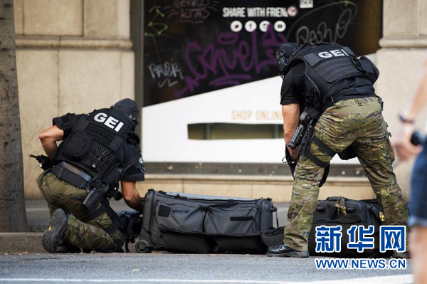 8月17日,在西班牙巴塞罗那,特警在发生汽车撞人恐怖袭击事件现场附近执勤。新华社发(利诺·德瓦利耶摄)