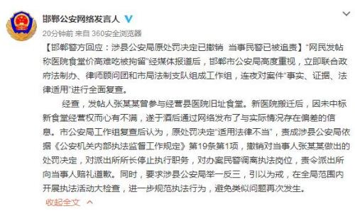 中新网邯郸8月21日电 (肖光明 张帆)针对日前有媒体报道河北邯郸涉县一网民发帖质疑县医院食堂价高难吃被拘留事件,8月20日,邯郸警方回应称根据复查已撤销涉县公安局对当事人张某某作出的处罚决定,已作出对当事派出所所长停职,办案民警调离执法岗位处罚,并责令派出所向当事人赔礼道歉。