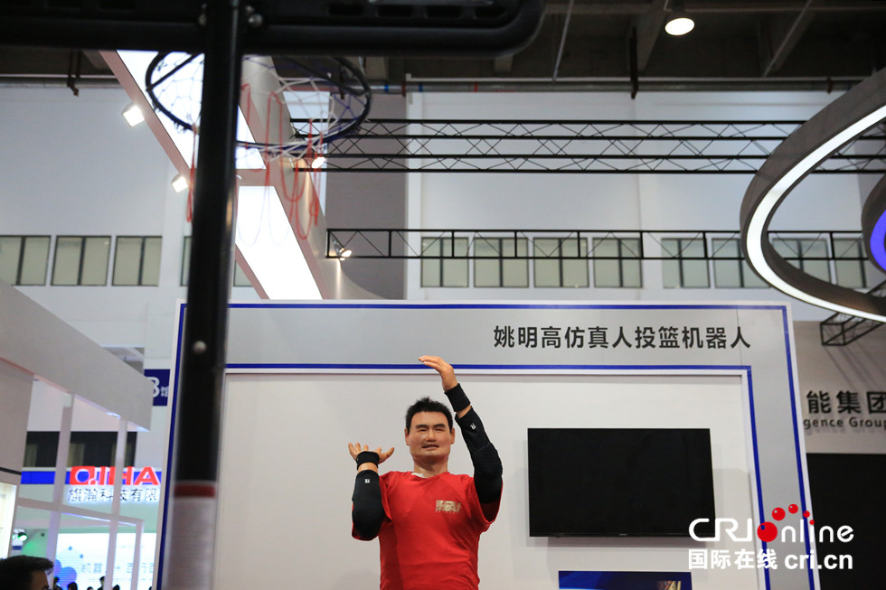 在展会B区一处的姚明高仿投篮机器人引起观众围观,据工作人员介绍,该机器人是1:1仿真人打造的,拥有与真人完全一样的外形、身高、毛发、肌肤;有真人一样的五官外貌,同时配合智能语音系统,将机器与人的关系变为人与人之间的交流。不过,有不少现场观众吐槽,这机器人根本不像姚明,反而神似“大衣哥”朱之文。