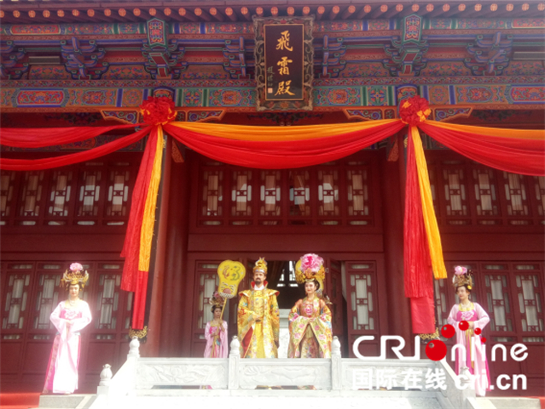 华清宫景区“唐明皇”与“杨贵妃”的两位扮演者在飞霜殿见证77对情侣礼成。(王梦凡 摄)