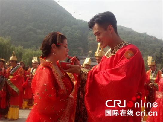国际在线陕西频道报道(王梦凡):8月27日,以“华清比翼连丝路,盛世文化享七夕”为主题的第九届华清宫中华七夕情人节活动在西安华清宫景区举行,7位外籍记者和7位华清宫《长恨歌》演员随机“配对”,与公开招募的70对幸运情侣一起身着唐装,在“唐明皇”与“杨贵妃”的两位扮演者的带领下,体验了一场“唐”味十足的仿古婚典。