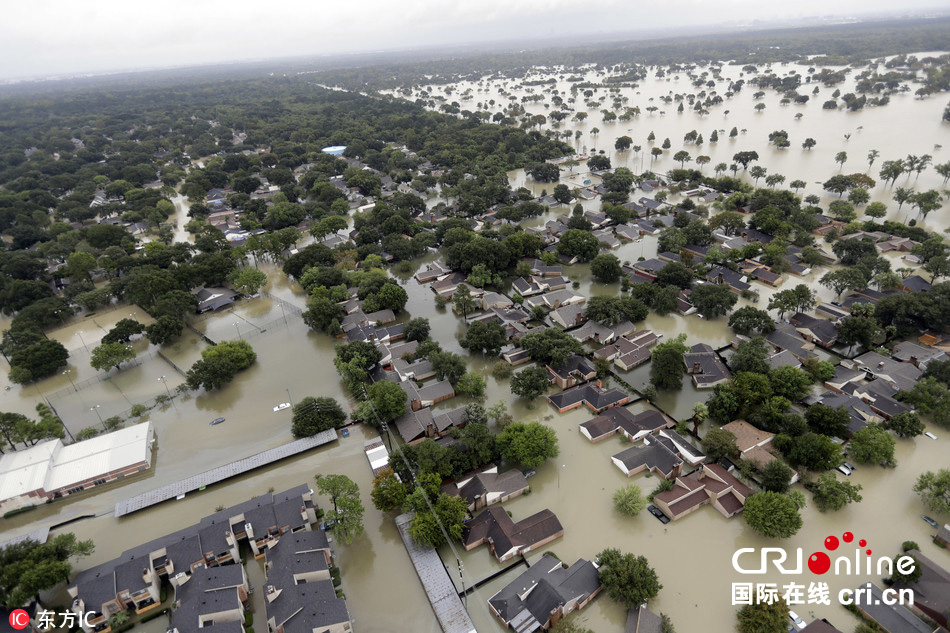 当地时间2017年8月29日,美国休斯顿,飓风“哈维”带来的强降雨引发洪灾,房屋皆被浸泡在水中。图片来源:东方IC