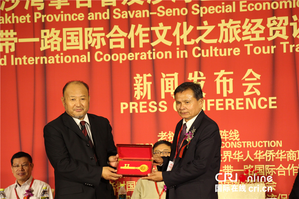 老挝建国全国阵线副总理兼秘书长森平叁帝威先生向“一带一路国际合作文化之旅访问团”中方团长梁海洋博士赠送“象征欢迎走进老挝” 开启老挝国门的金钥匙.