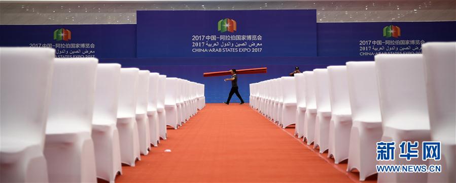 工作人员在宁夏国际会堂布置会场(9月3日摄)。 2017中国—阿拉伯国家博览会将于9月6日至9日在宁夏银川举办,目前本次博览会各场馆的布展已进入收尾阶段。 新华社记者 李然摄