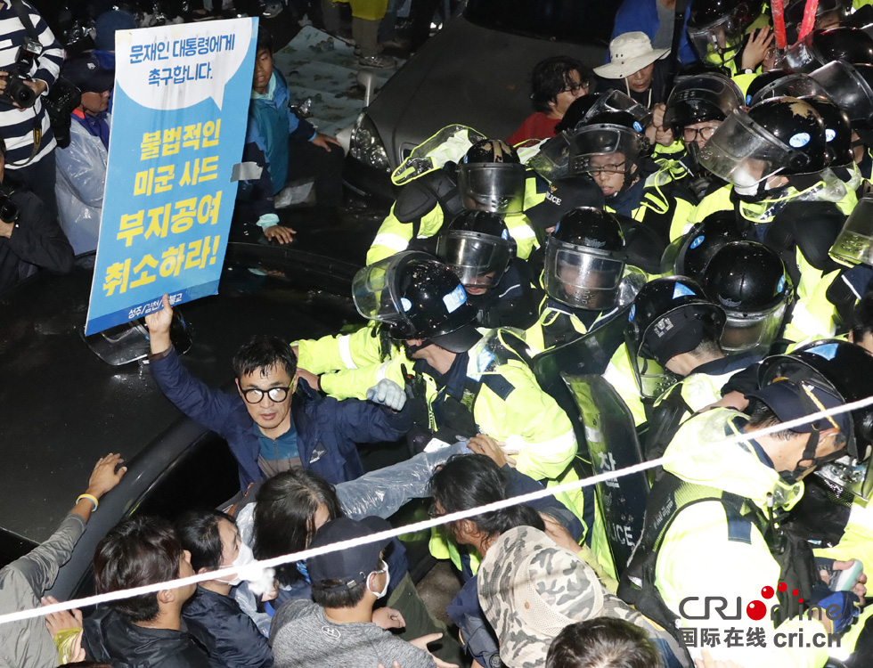 当地时间2017年9月6日,韩国星州郡,韩国于7日凌晨部署剩下的4辆“萨德”发射车,反“萨德”民众封路阻抗,与警方发生激烈冲突。(图片来源: 东方IC)
